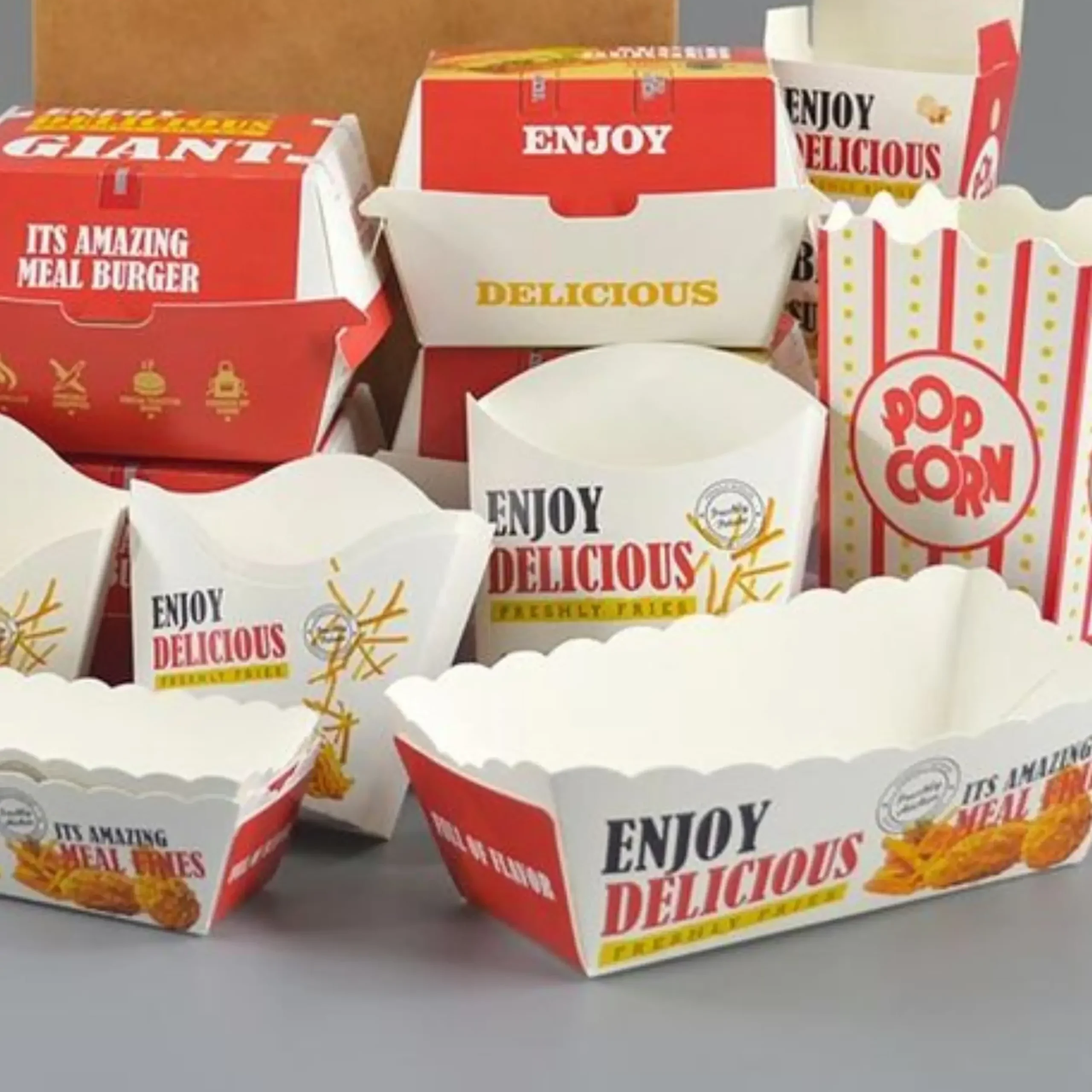 Produce el empaque adecuado para tu negocio con nuestra gama de modelos de cajas y empaques personalizados, sea para envio, restaurantes o eventos.